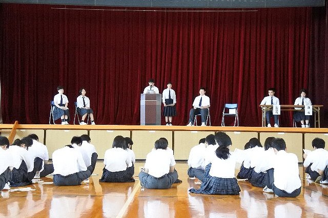 生徒総会では、生徒会や専門委員会の代表者が全校生徒の前に立ち、年間活動計画や目標を述べ、承認を得ました。引き締まった空気の中で、さまざまな議題について皆で考えを深めることができました。
