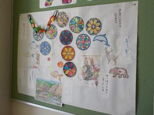 1年生の掲示板に、それぞれのクラスで曼荼羅塗り絵や折り紙などで思い思いに彩りました。