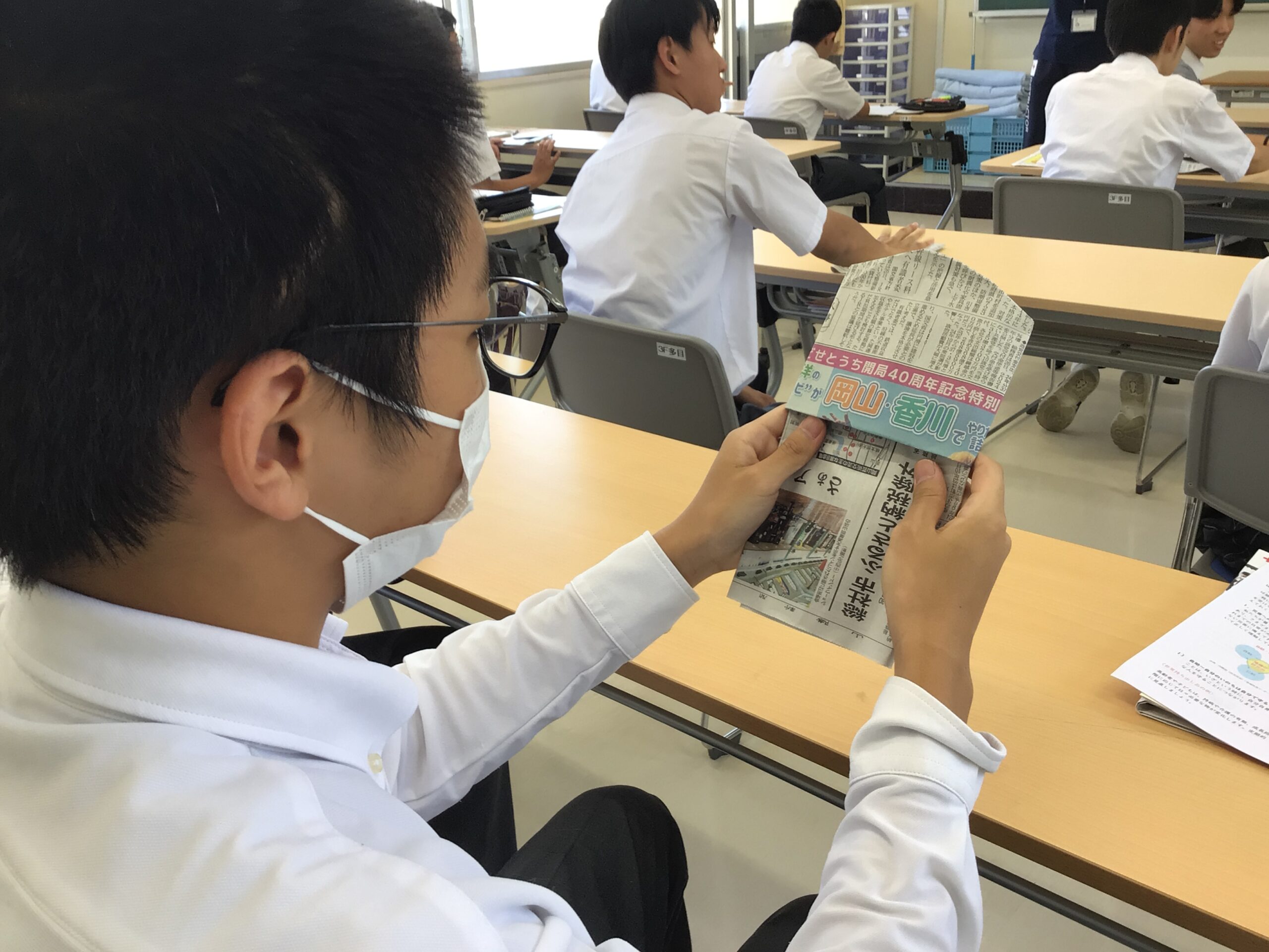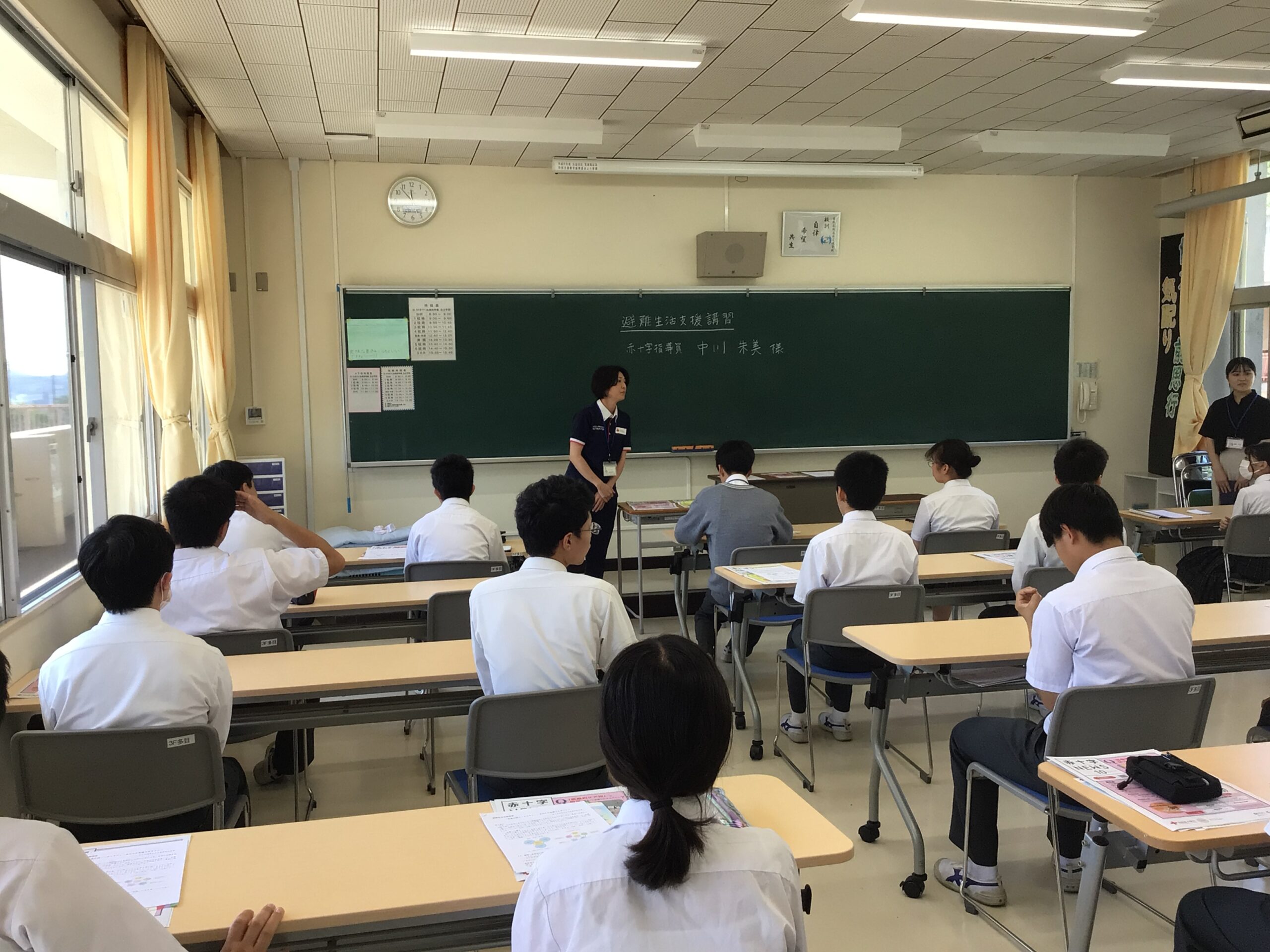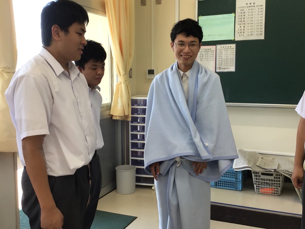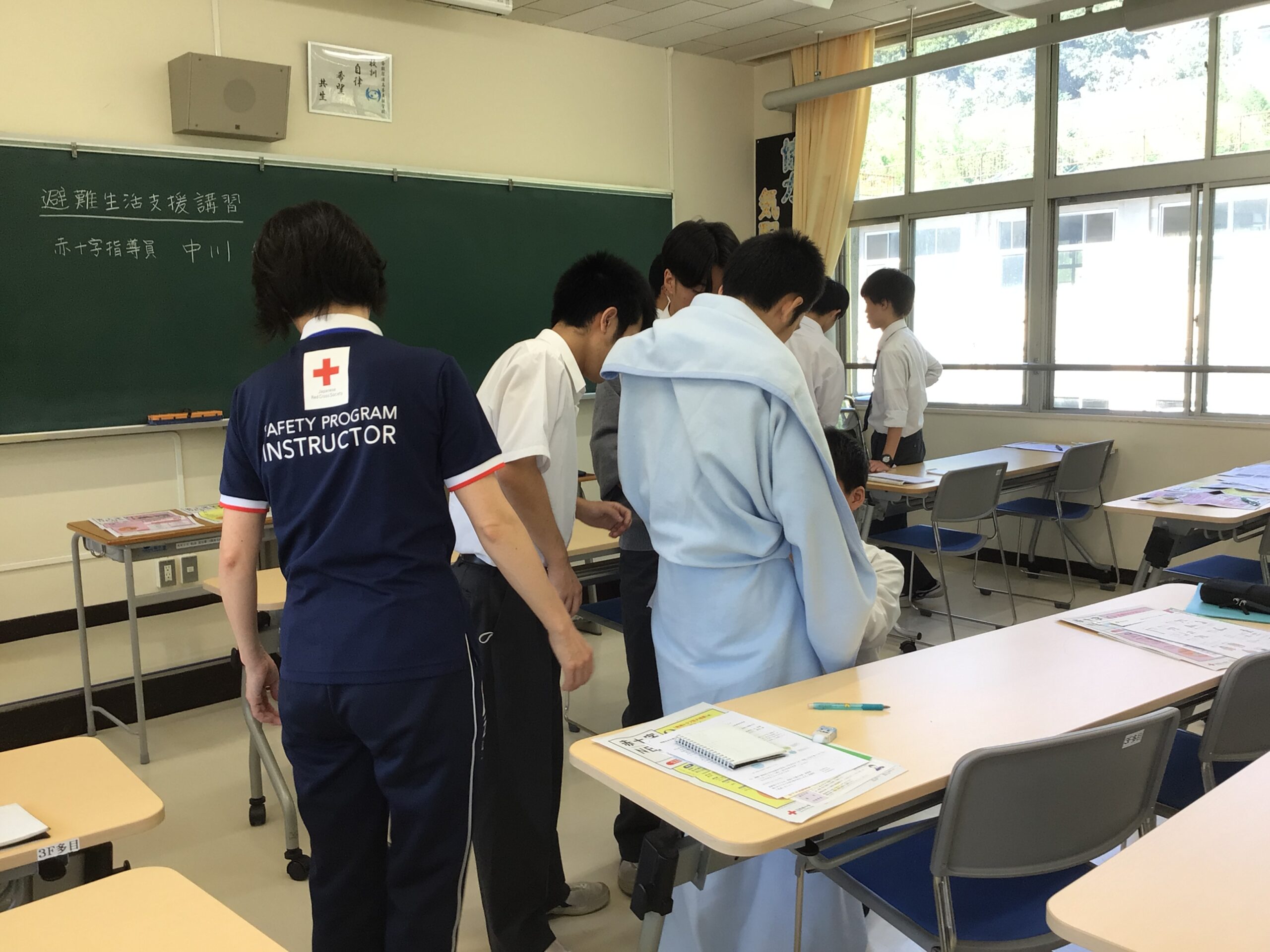避難生活支援講習を受けました! 3年生 2025.10.08 赤十字指導員の中川朱美様より、災害発生時の避難生活での注意点と心構えを教えていただきました。防寒に備えて毛布とストッキングでガウンを作ったり、新聞紙でスリッパを折って作ったりして、身近にあるものを活用する方法を学びました。