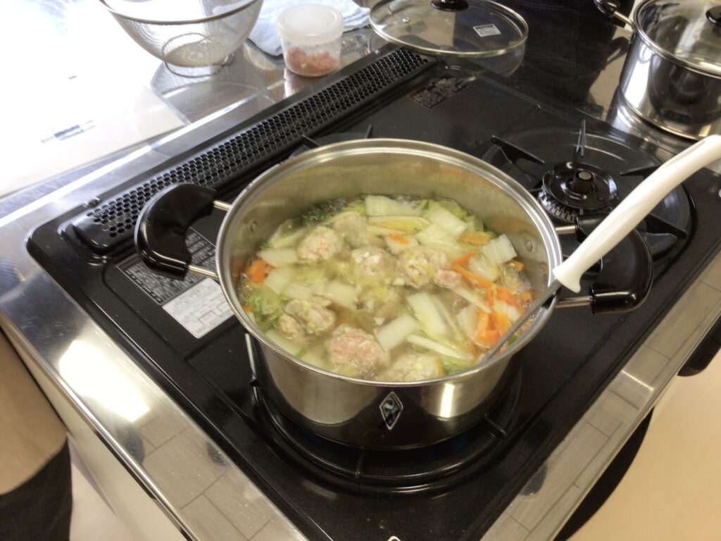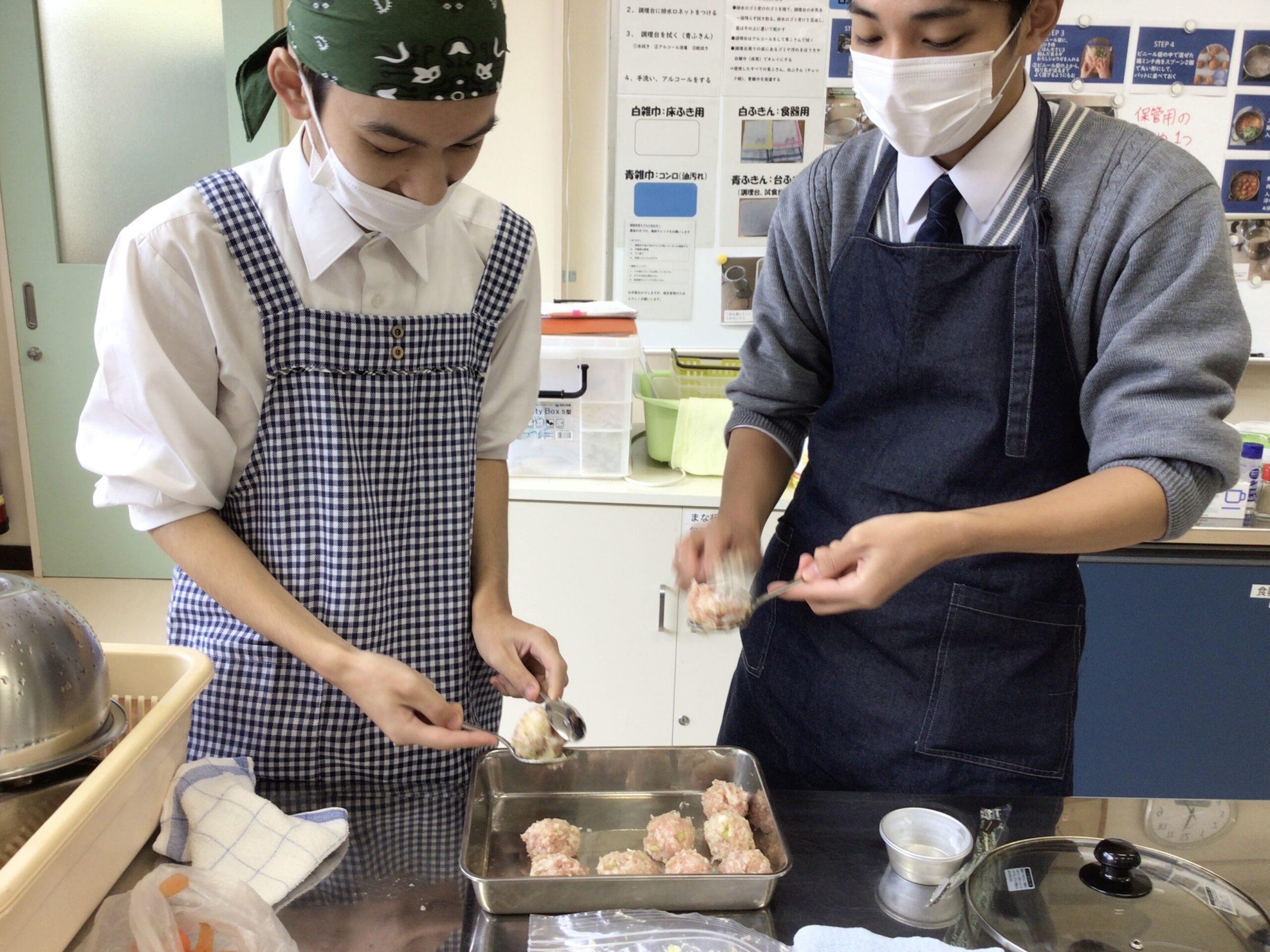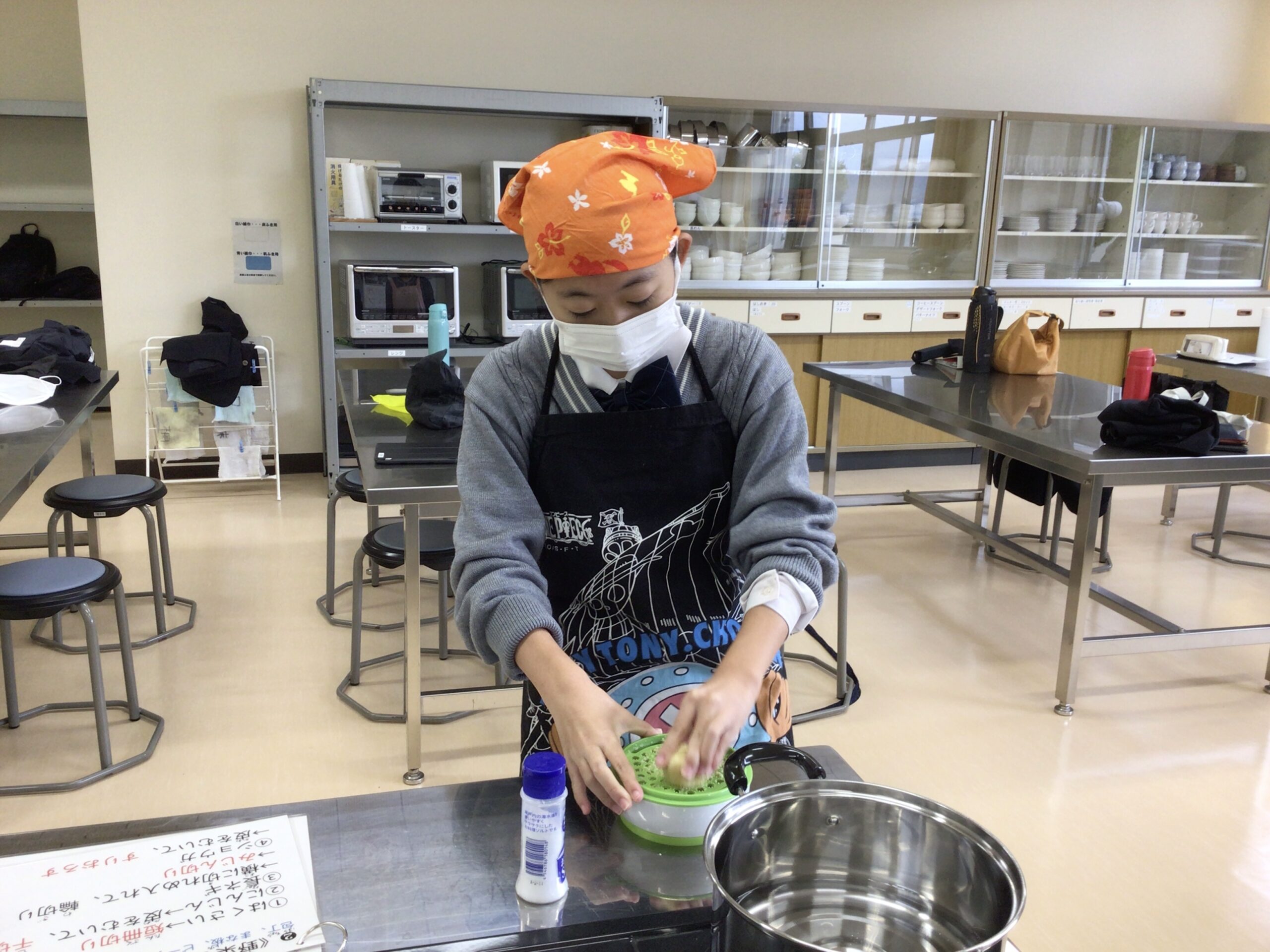 調理実習をしました 3年生 2025.11.19 3年生になって初めての調理実習です。メニューは「鶏団子スープとおむすび」で、肉団子はビニール袋に入れて混ぜ、衛生的で洗い物も少なくしました。生姜もすりおろして、冬にぴったりで体も温まりました。さすが3年生、調理と同時に片付けもしっかり短時間でできました。