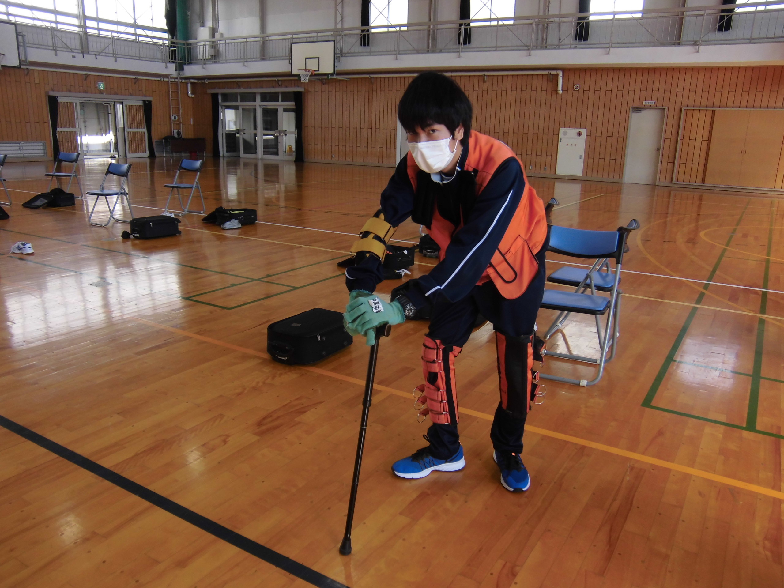 後半は、実際に高齢者の身体の動きを疑似体験できるプログラムを行いました。専用の器具や手袋を装着し、体が動かしにくい状態で階段の上り下りに挑戦したり、小銭をポーチから取り出す細かな作業に挑戦したりしました。思うように動かせないもどかしさや不安を感じながら、「高齢者の方の気持ちが少し分かった気がする」と話す生徒の声もありました。