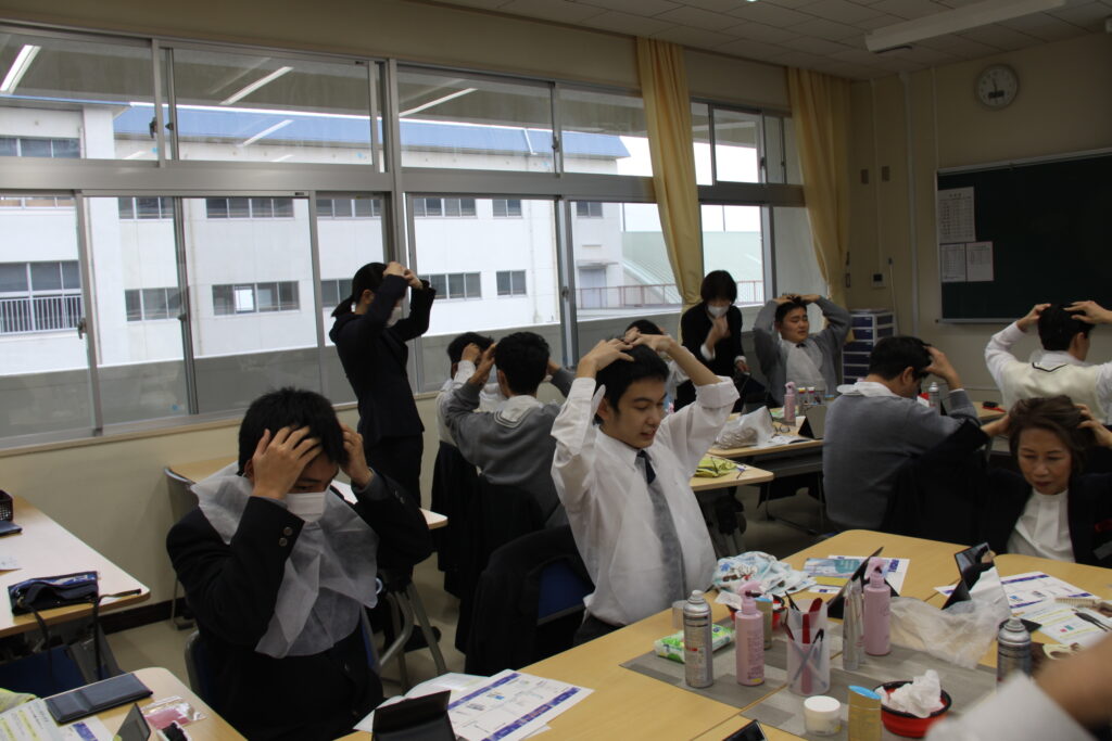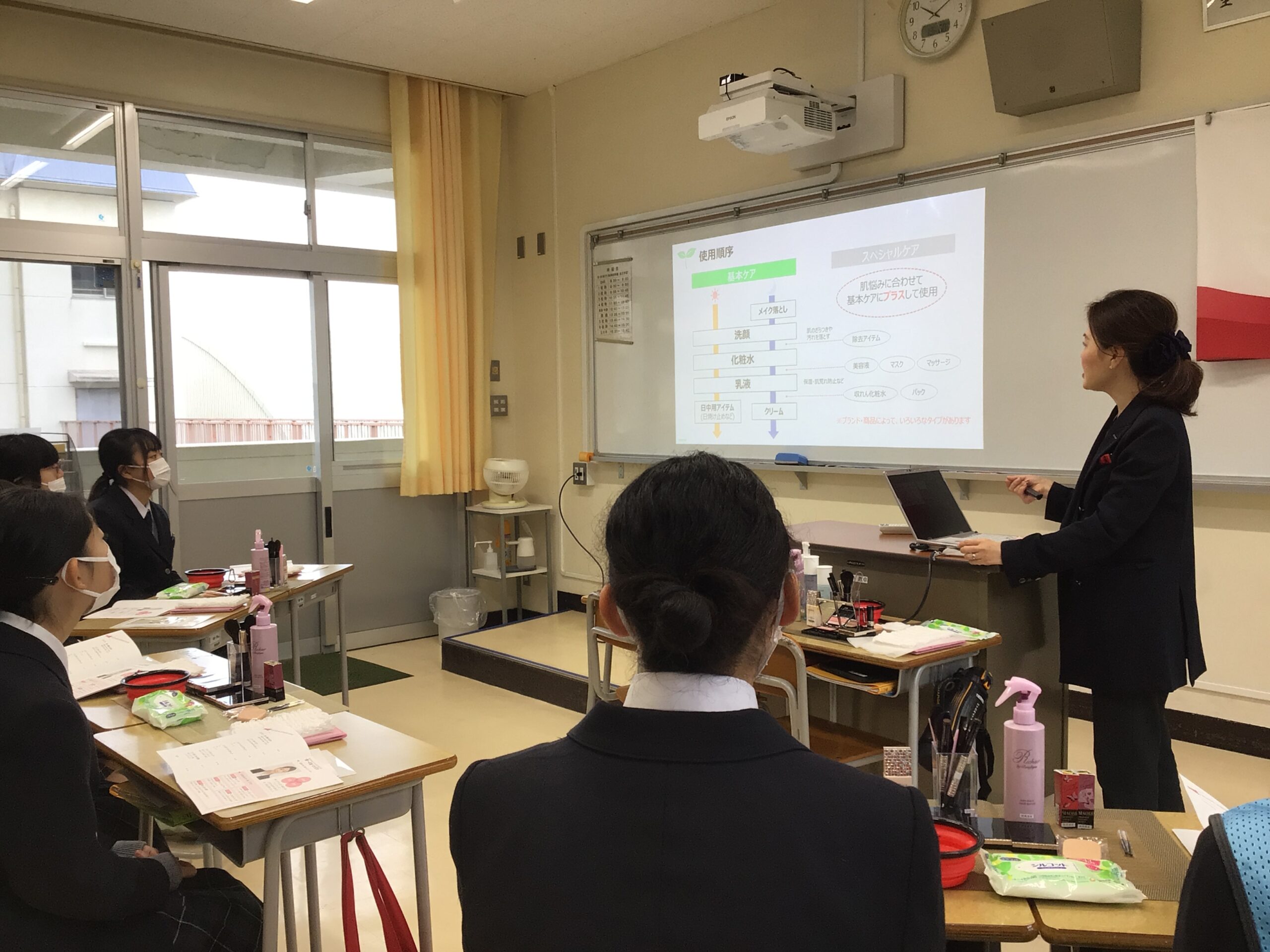 身だしなみ講座を受講しました! 3年生 2025.12.24 講師の先生をお招きし、身だしなみについて教えていただきました。洗顔の仕方やメイクアップの方法、ヘアセットまで実践形式で学ぶことができ、真剣な表情で受講していました。