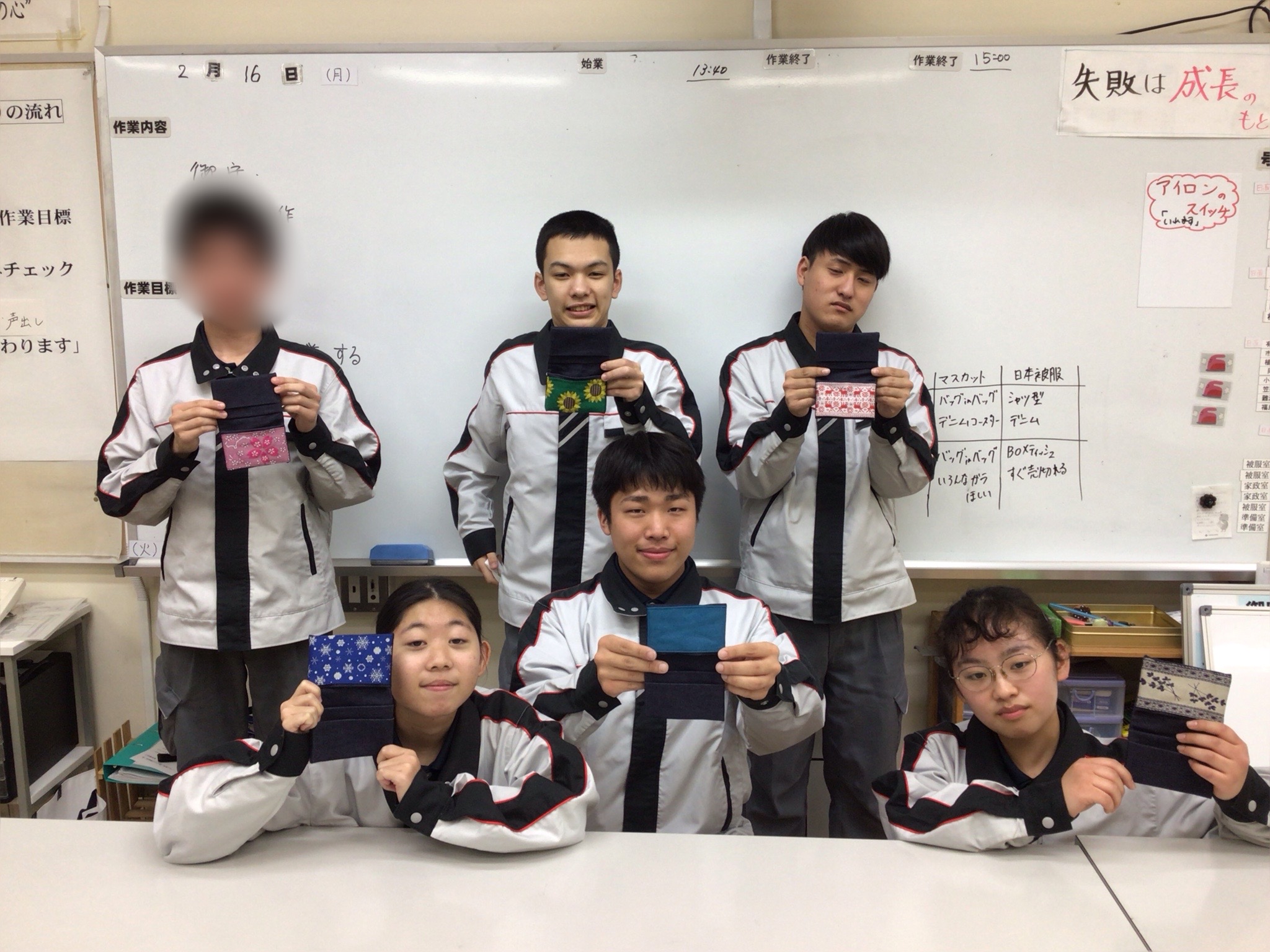 家政コースで卒業製作をしました。 3年生 2026.02.17 3年生家政コースが、卒業製作としてデニムと畳縁を使ったカード入れを作製しました。3年間コースで培った技術と集中力を発揮し、2時間という限られた時間の中で素敵な物を作り上げました。卒業まで残りわずかとなった時間を大切に、残りのコースや授業にも取り組んでいきましょう!