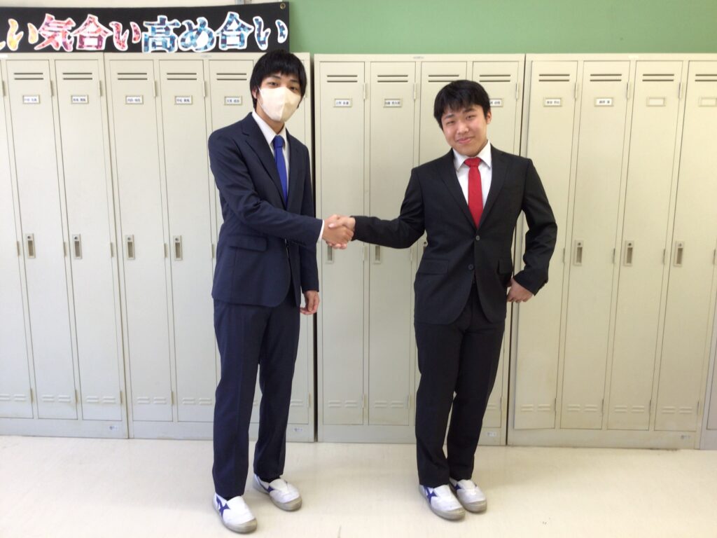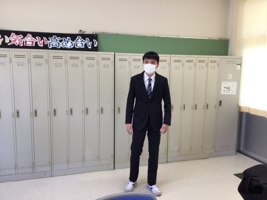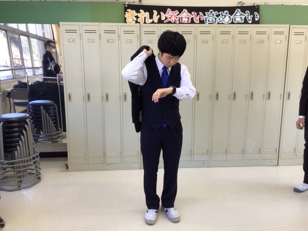 3年生「着こなし講座」で学びました! 3年生 2026.02.17 2月17日、洋服の青山の講師の方より、3年生全員がスーツの着こなし方と選び方を学びました。第一印象が大切であると最初に教えていただき、一つ一つ注意すべきことをメモしながら真剣に聞きました。30分の講義の後、いよいよスーツの試着!みんなそれぞれ色も柄も違うスーツに赤、青、紺などのネクタイをキリッと締めました。先生方にほめられて、少し照れながらの写真撮影でした。
