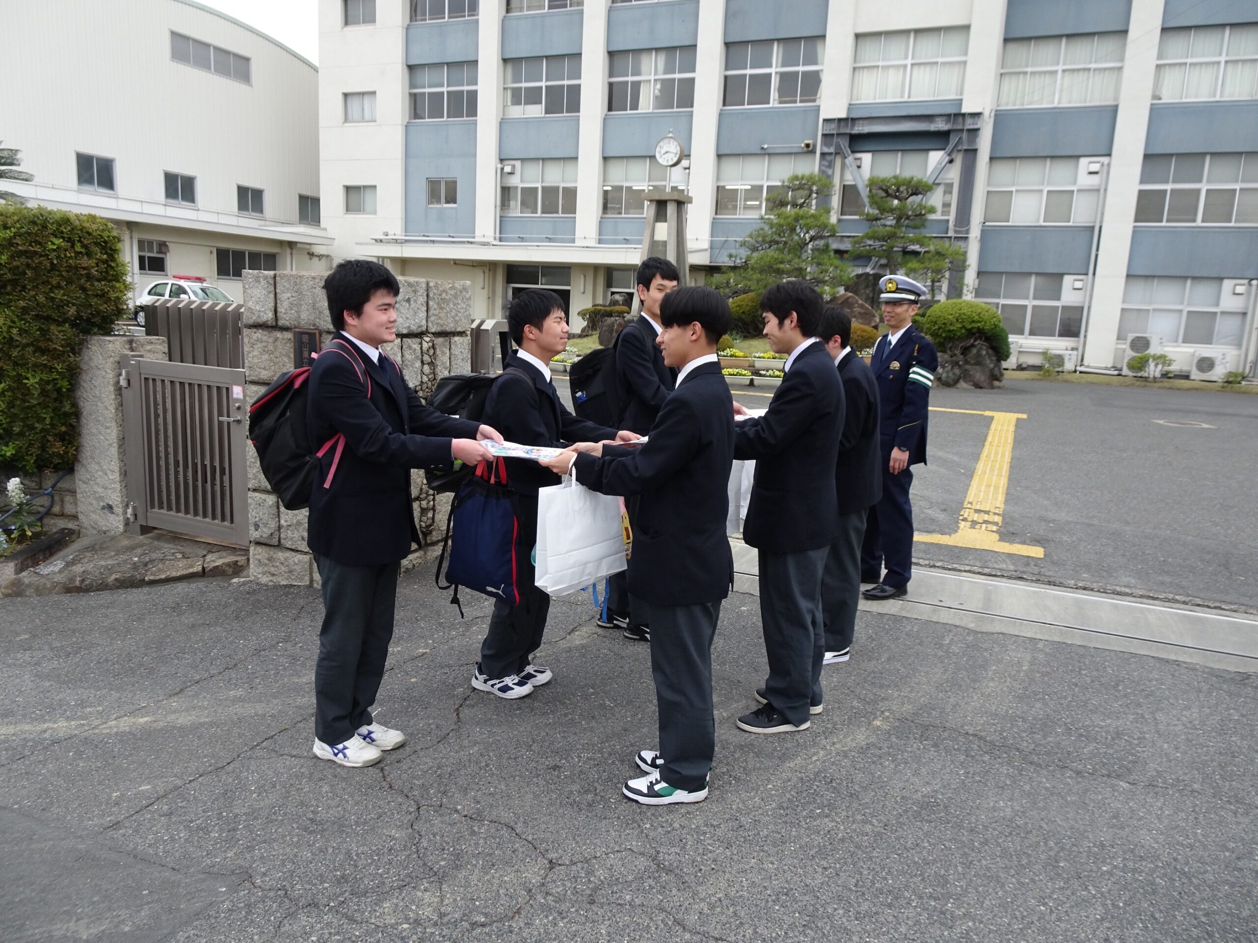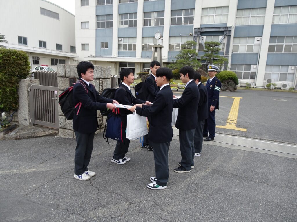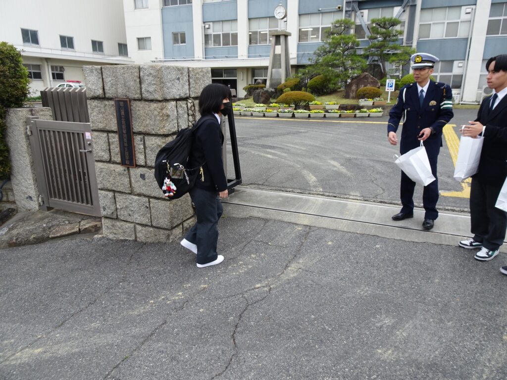 児島警察署×琴浦高等支援学校:自転車マナーを再確認!交通安全運動に参加しました。 日々の琴浦 2026.04.13 私たちは児島警察署と協力して、交通安全運動に参加しました。 今回の活動場所は、私たちの学校、倉敷琴浦高等支援学校の校門です。 バス通学や自転車通学をする生徒にとって、あらためて「安全に道路を利用する」ことの重要性を肌で感じることができた一日となりました。