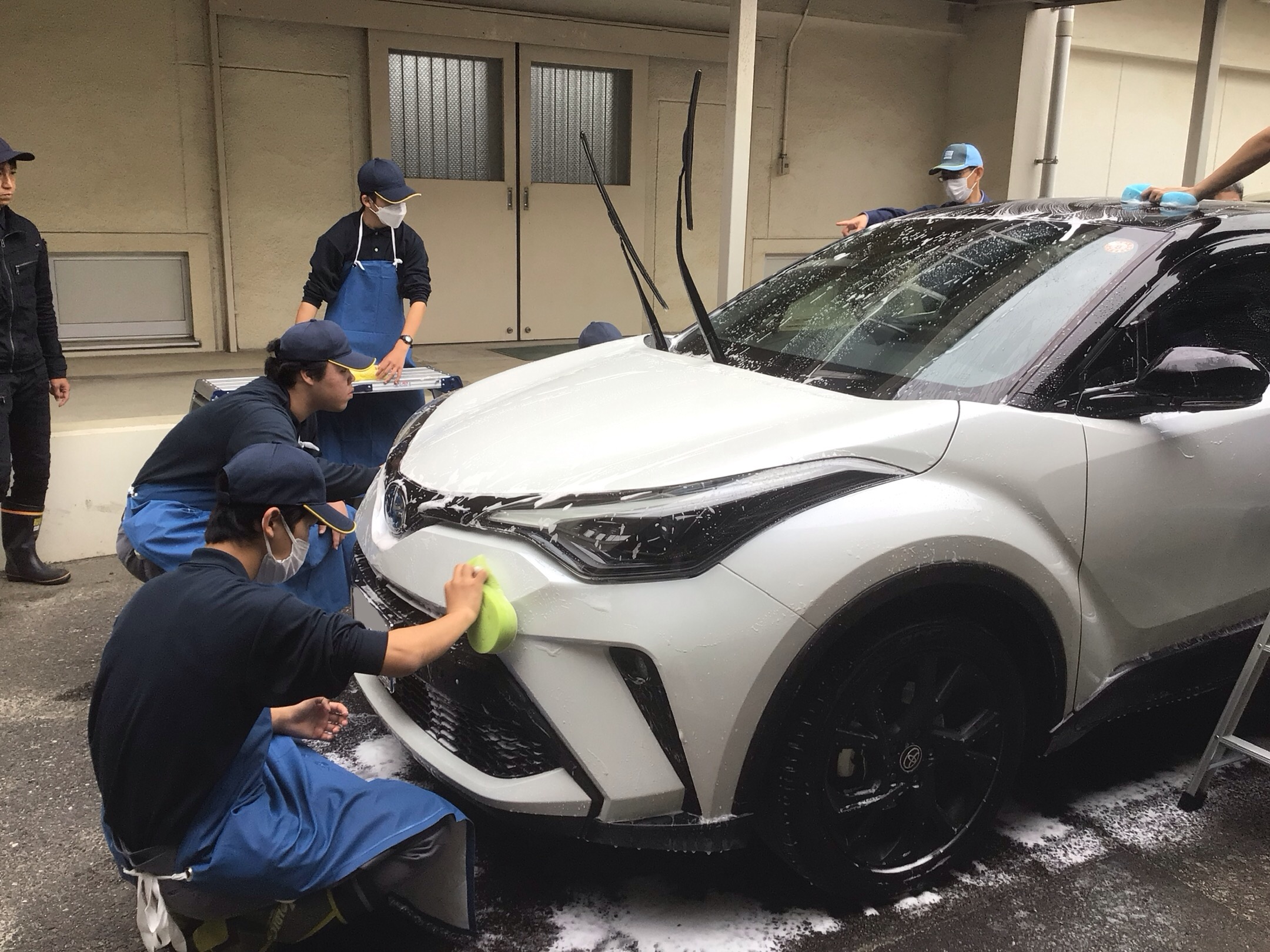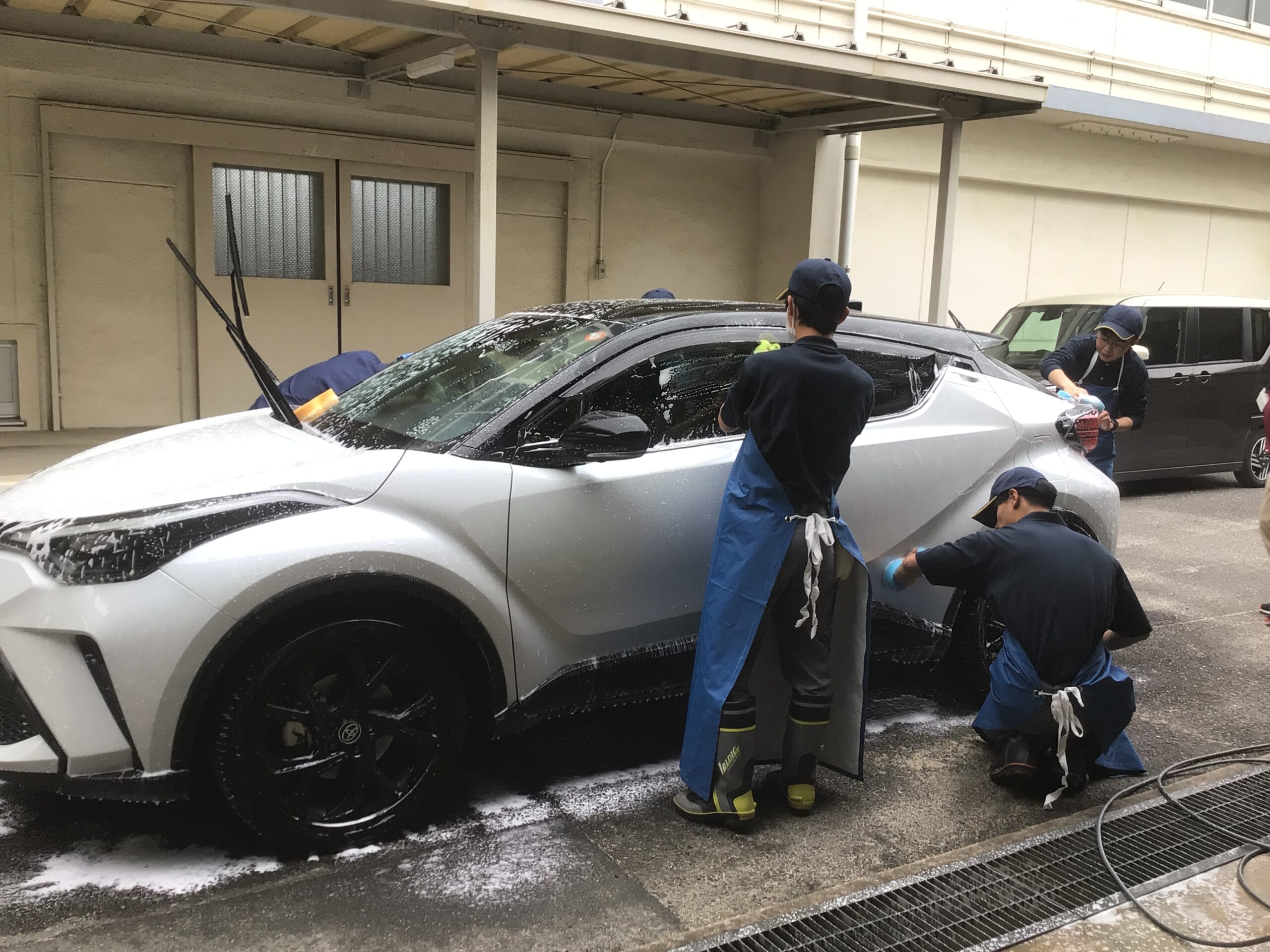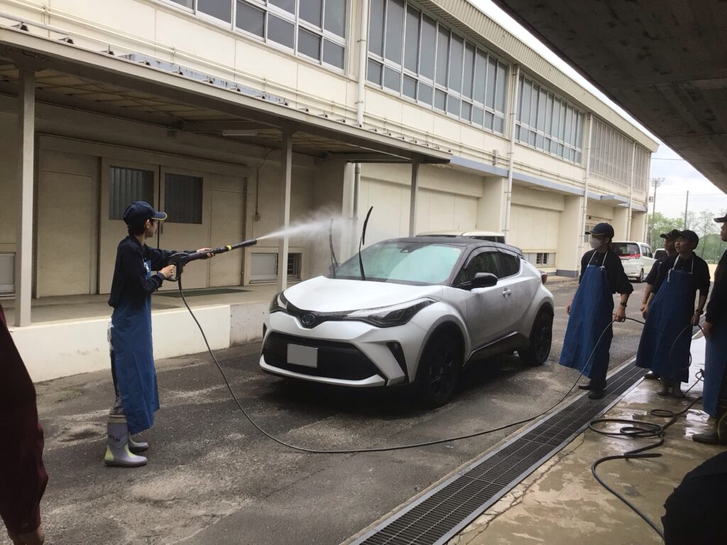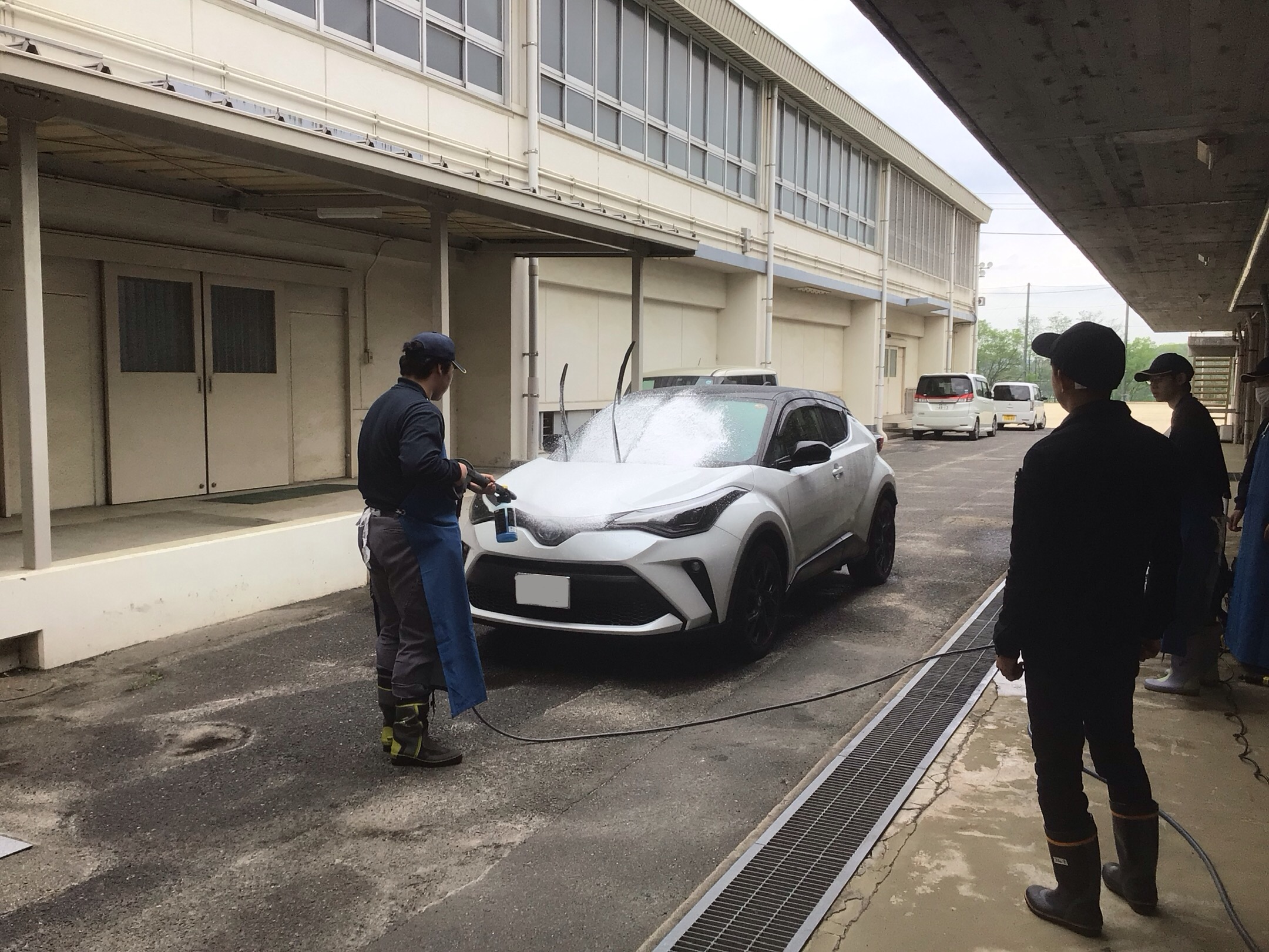 プロの仕上がりを目指して!洗車の授業をしました 3年生 2026.04.17 今年度から新たに、流通サービスコース3年生のカリキュラムに、洗車の授業が加わりました。 水しぶきを浴びながら、隅々まで汚れを落とそうとするひたむきな姿勢は、まさに「一生懸命」という言葉がぴったりでした。 ただ車を綺麗にするだけでなく、車や道具を大切に扱う心や、細部への心配りを学ぶこの授業ですが、生徒たちの熱量に圧倒されました。