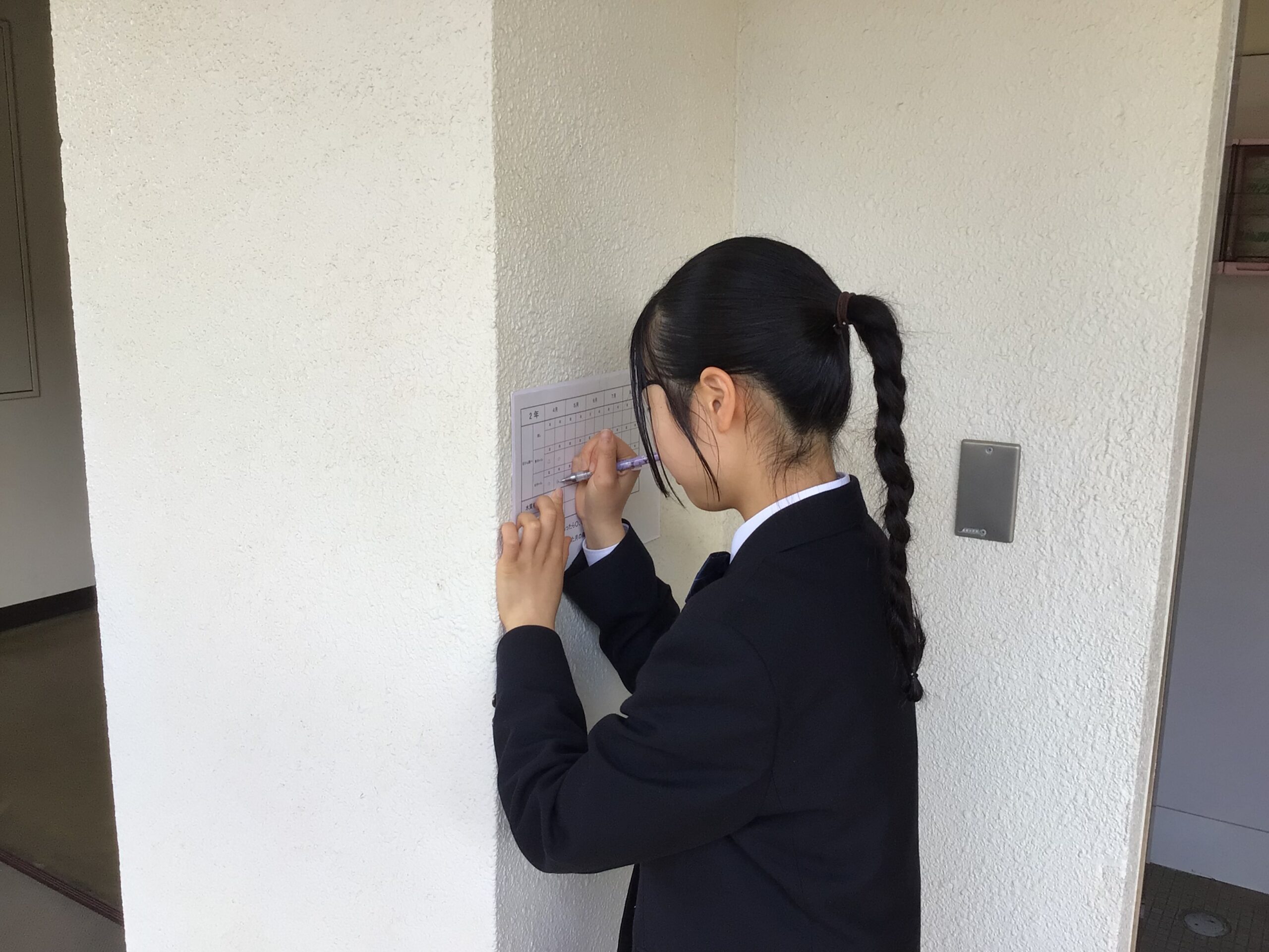 最後は、点検した結果をチェックリストに記入します。 異常がないか、いつ、誰が点検したのかを正確に記録に残すことで、学校全体の衛生管理が守られています。