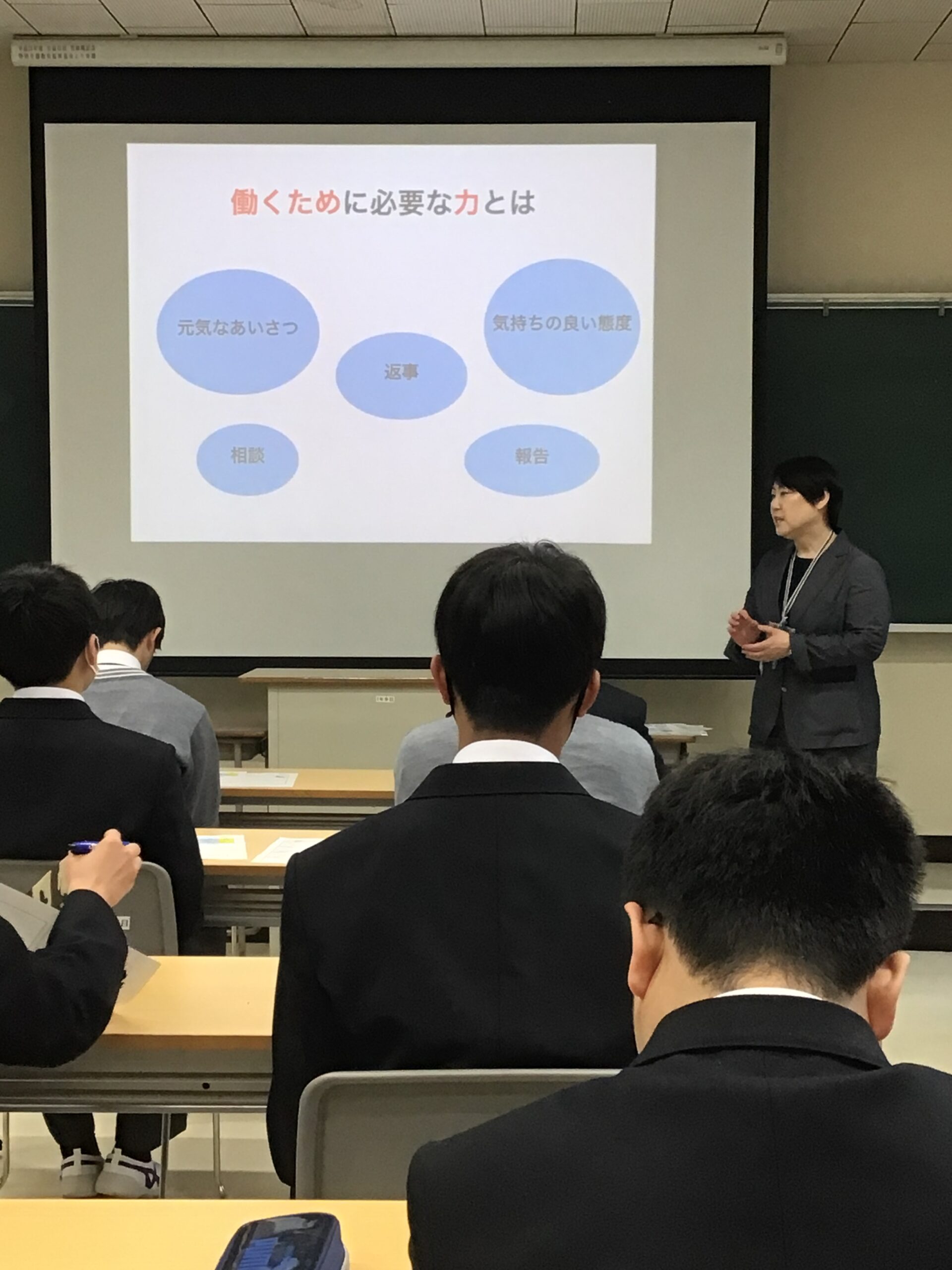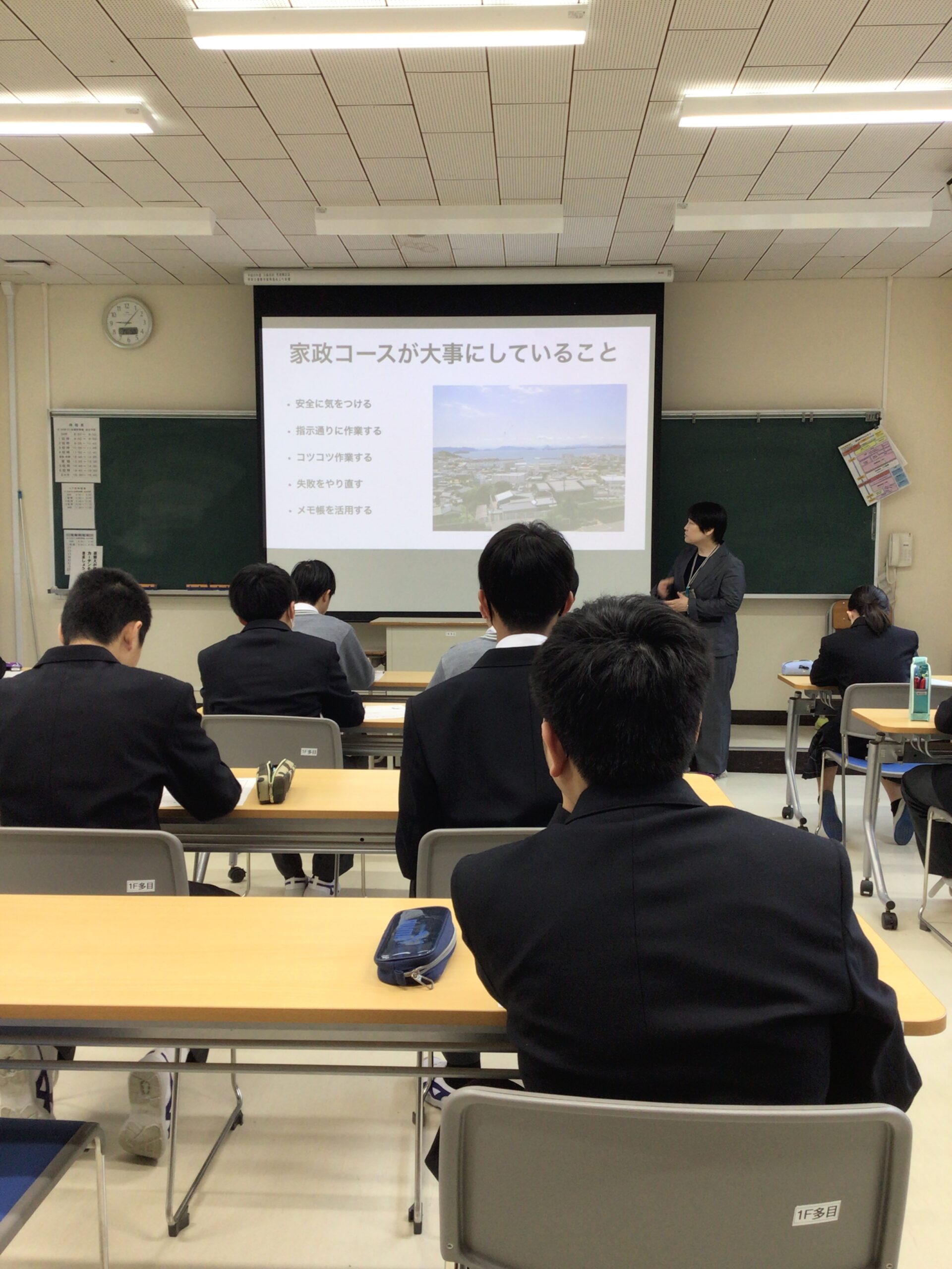 1年生コースオリエンテーションがありました。 1年生 2026.04.23 各コース主任の先生から「コースについての説明」や「働くために必要なこと」などのお話がありました。生徒たちは真剣な表情でメモを取りながら聞いていました。明日は、先輩たちのコース授業を見学させてもらうことになっています。